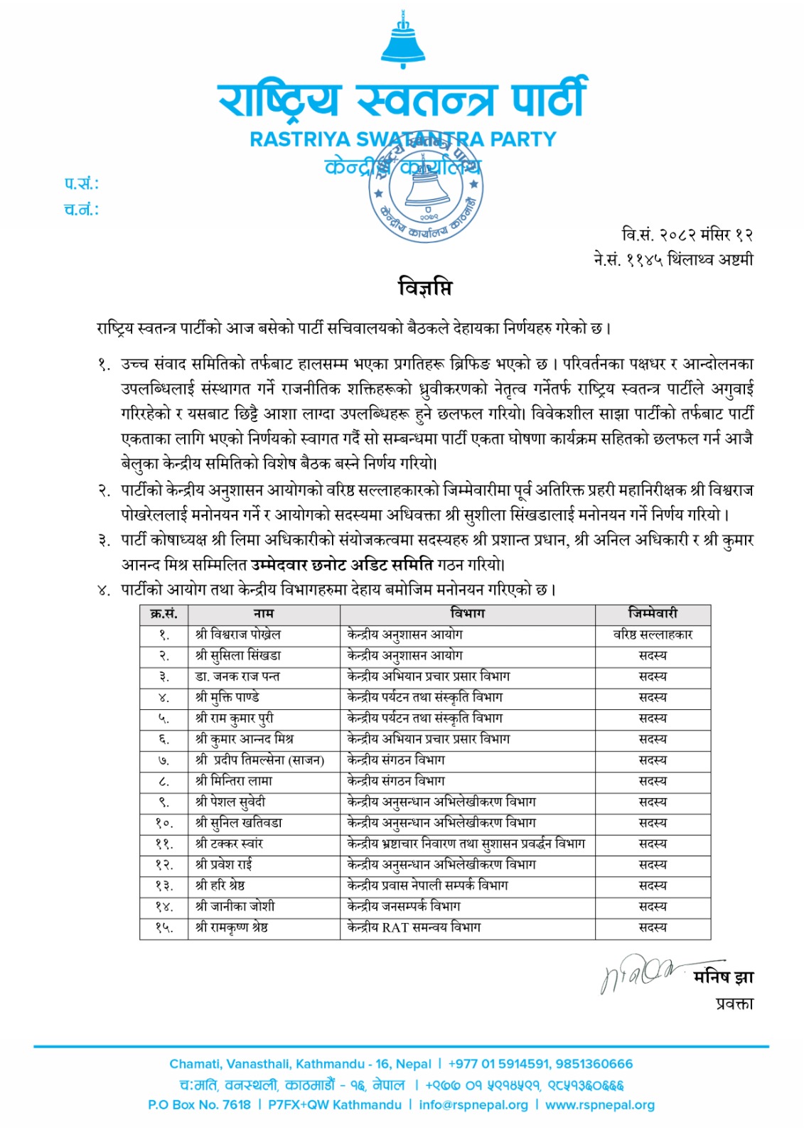 विघटित प्रतिनिधसभामा चौथो शक्तिका रुपमा रहेको राष्ट्रिय स्वतन्त्र पार्टी यतिबेला बैकल्पिक शक्तिहरुलाई एकजुट बनाएर फागुन २१ मा हुने प्रतिनिधसभा चुनाव मार्फत पहिलो शक्ति बन्ने दाबी गरिरहेको छ । केहि राजनीतिक दलहरुलाई समाहित गर्दै रास्वपा चर्चीत अनुहार र सामाजिक जीवनमा ख्याती कमाएका व्यक्तिहरुलाई भटाभट् पार्टीमा भित्र्याईरहेको छ । फागुन २१ का लागि तय भएको प्रतिनिधिसभा चुनावमा के बैकल्पिक शक्तिहरुले परम्परागत दलहरुलाई चुनौति दिन सक्लान त? नेपाल प्रहरीका पूर्व अतिरिक्त महानिरीक्षक विश्वराज पोखरेलले शुक्रबार राष्ट्रिय स्वतन्त्र पार्टी प्रवेश गर्नु भएको छ । उहाँले जनताको आसा र भरोसा रास्वपामा रहेको र अब यो पार्टीले मात्रै मुलुक र जनताको विश्वास जित्ने भन्दै आफु पनि परिवार्तनको एक हिस्सेदार हुन रास्वपा प्रवेश गरेको बताउनु भयो । पार्टीका सभापति रवि लामिछानेले देखाएको सपना र दिलाएको विश्वासले अब धेरै मानिसलाई यस अभियानमा जोड्ने भन्दै उहाँले परिवर्तन सस्थागत गर्न र आसा लाग्दो भविष्य बनाउन यस पार्टीको निर्माणमा लागेको बताउनु भयो ।